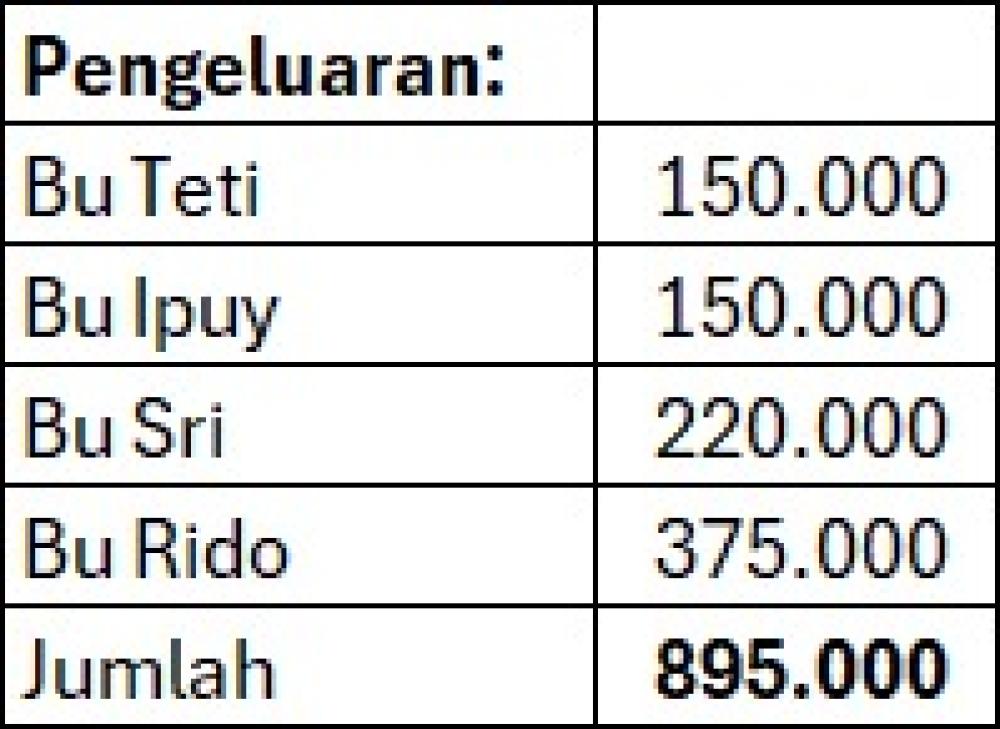 | Pemasukan/Pengeluaran Pekan 1 | 0,00 | 1.895.000,00 | - 1.895.000,00 | |