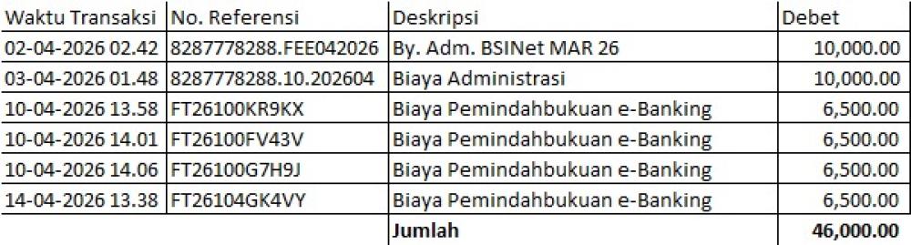 | 2026-04-14 | 1 Biaya Pemindahbukuan e-Banking & Admin | 46.000,00 | ||